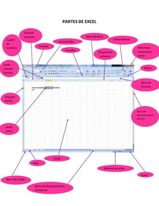 Este documento describe las partes principales de una hoja de cálculo de Excel, incluyendo la barra de título, pestañas, celdas, etiquetas de filas y columnas. También incluye preguntas sobre hojas de cálculo, funciones como SUM y ABS, y la diferencia entre fórmulas y funciones. Finalmente, define lo que es un rango en Excel.