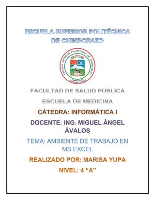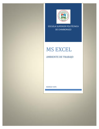 Este documento describe el ambiente de trabajo en Microsoft Excel. Identifica las partes principales de la ventana de Excel como la barra de título, barra de menús, barra de herramientas, barra de fórmulas y área de trabajo. Explica cómo abrir y guardar archivos, desplazarse entre hojas y celdas, seleccionar celdas, introducir datos, y usar funciones básicas como deshacer y rehacer acciones. El objetivo es familiarizar a los lectores con la interfaz de usuario de Excel y sus capacidades fundamentales.