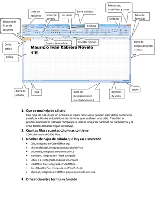 Este documento proporciona información sobre hojas de cálculo en Excel. Explica que una hoja de cálculo permite usar y realizar cálculos automáticos con datos numéricos. Detalla que Excel contiene 256 columnas y 65536 filas y menciona algunos programas de hoja de cálculo populares. Distingue entre fórmulas y funciones, señalando que las funciones permiten realizar cálculos más complejos. Finalmente, define un rango como un conjunto de celdas adyacentes en Excel.