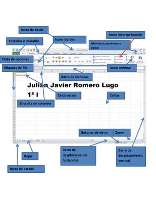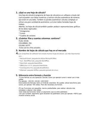 Una hoja de cálculo permite ingresar y realizar cálculos automáticos con datos numéricos en una tabla. Contiene hasta 65536 filas y 256 columnas con 16777 celdas. Las hojas de cálculo más populares son Microsoft Excel, OpenOffice Calc, Lotus 1-2-3 e IBM Quattro Pro. Las fórmulas realizan operaciones simples en celdas, mientras que las funciones ejecutan cálculos más complejos o en rangos de celdas mediante macros predefinidas. Un rango se refiere a un conjunto de dos o más