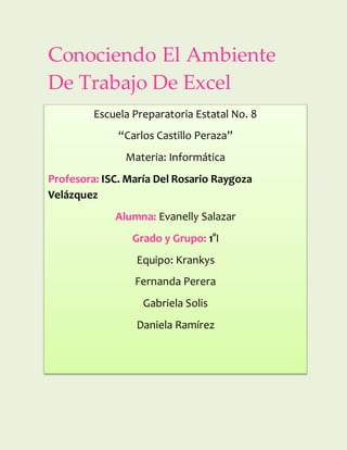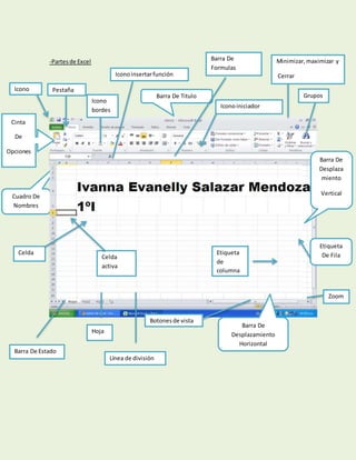 Este documento proporciona información sobre las partes principales de una hoja de cálculo de Excel, incluyendo la barra de título, pestañas, cinta de opciones, celdas y más. Explica que una hoja de cálculo es una herramienta útil para trabajar con números y realizar cálculos. También resume las diferencias entre fórmulas y funciones, y proporciona ejemplos de funciones comunes como matemáticas, estadísticas y financieras. Finalmente, define un rango como un conjunto de dos o más celdas