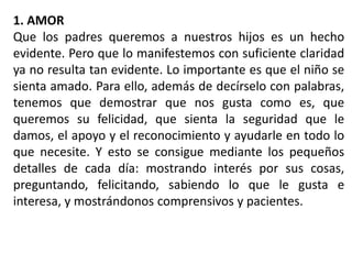 Para que el ambiente familiar influya positivamente en los niños, es fundamental que haya amor, una autoridad participativa, la intención de servir a los hijos, un trato positivo, y tiempo de convivencia. Específicamente, los padres deben demostrar su amor a través de detalles diarios, ejercer una autoridad persuasiva cuando los hijos son pequeños y participativa cuando son mayores, buscar la felicidad de los hijos a través de su autoridad, comentar lo positivo de sus hijos y pareja, y compartir tiempo de calidad en fam