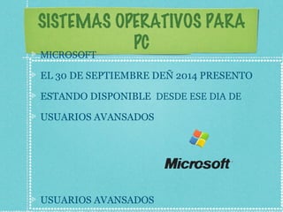 El documento resume brevemente varios sistemas operativos populares para computadoras personales y dispositivos móviles, incluyendo Windows 10 de Microsoft, macOS de Apple, Linux, Android de Google y iOS de Apple.