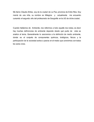 Claudia Brites vive en La Paz, Entre Ríos con su hija Milagros. Actualmente cursa el segundo año del profesorado de Geografía en la Universidad de Entre Ríos. El documento explica que cuando hablamos de Ambiente nos referimos a todo lo que nos rodea, incluyendo los componentes químicos, biológicos, físicos y la participación de la sociedad en el medio ambiente donde convivimos con otros seres vivos.