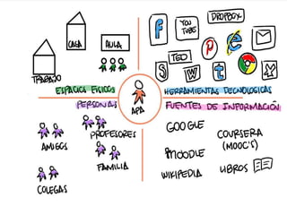 El documento define qué es un PLE (Personal Learning Environment o Entorno Personal de Aprendizaje). Un PLE ayuda a estudiantes y profesores a tomar control y gestionar su propio aprendizaje mediante el uso de tecnología. Un PLE permite a las personas establecer sus propios objetivos de aprendizaje, gestionar el contenido y procesos de aprendizaje, y comunicarse con otros para lograr dichos objetivos. Se basa en la idea de que el aprendizaje ocurre en diferentes contextos y no depende de un solo proveedor,