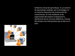 El documento describe los ambientes virtuales de aprendizaje, los cuales son entornos interactivos mediados por la tecnología donde se da la organización del espacio, el manejo del tiempo y las interacciones. Dentro de estos ambientes, los profesores toman decisiones sobre el diseño del espacio y los materiales, y adecuan los contenidos a las necesidades de los estudiantes. Además, los ambientes virtuales facilitan la comunicación y distribución de información entre estudiantes y profesores.