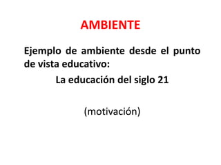 El documento define los términos ambiente, ambiente de aprendizaje y ambiente virtual de aprendizaje. Explica que un ambiente de aprendizaje es el escenario donde se desarrollan condiciones favorables para el aprendizaje, mientras que un ambiente virtual de aprendizaje es un entorno de aprendizaje mediado por tecnología que transforma la relación educativa facilitando la comunicación y procesamiento de información. Los ambientes virtuales de aprendizaje son instrumentos que posibilitan las interacciones entre sujetos y median la relación con el