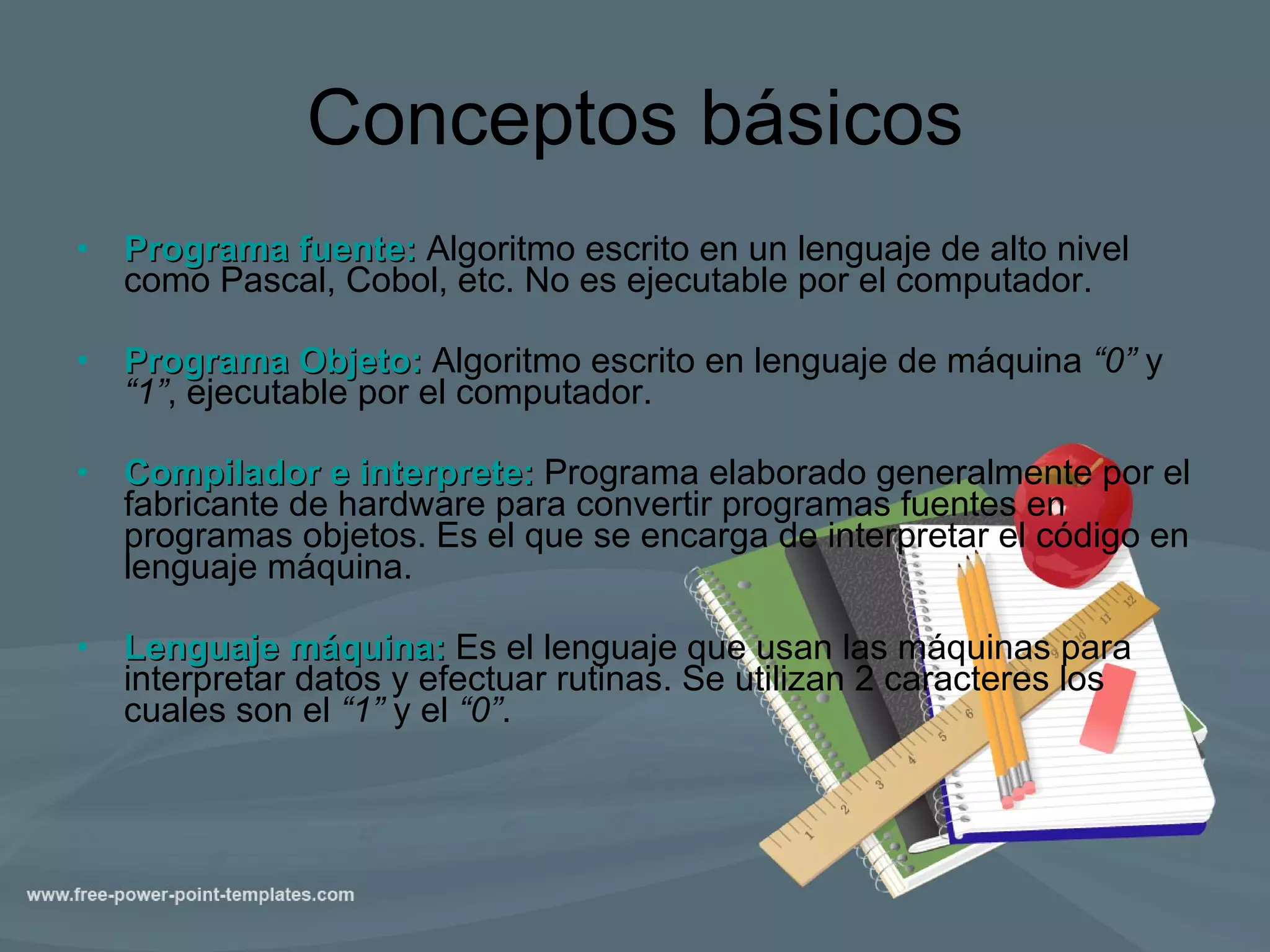 Conceptos básicos Programafuente: Algoritmo escrito en un lenguaje de alto nivel como Pascal, Cobol, etc. No es ejecutable por el computador. Programa Objeto: Algoritmo escrito en lenguaje de máquina “0” y “1” , ejecutable por el computador. Compilador e interprete: Programa elaborado generalmente por el fabricante de hardware para convertir programas fuentes en programas objetos. Es el que se encarga de interpretar el código en lenguaje máquina. Lenguaje máquina: Es el lenguaje que usan las máquinas para interpretar datos y efectuar rutinas. Se utilizan 2 caracteres los cuales son el “1” y el “0” .
