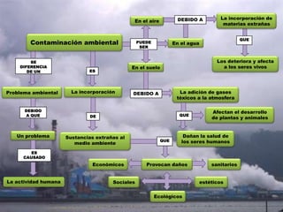 Este documento trata sobre los tipos de contaminación ambiental. Identifica varias formas en que la contaminación puede ocurrir, incluyendo en el aire, agua y suelo. También explica que la contaminación es causada por la incorporación de sustancias extrañas al medio ambiente debido a la actividad humana y puede tener consecuencias económicas, sociales y ecológicas. Finalmente, clasifica los tipos de contaminación según el contaminante, como visual, química, electromagnética, acústica, lumínica y térmica