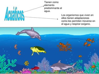 El documento describe diferentes ambientes acuáticos y terrestres. Habla sobre humedales como zonas de transición entre ambientes acuáticos y terrestres donde el nivel de agua fluctúa y los organismos tienen adaptaciones para moverse en el agua y respirar. También describe bosques como ambientes terrestres donde la vida depende de la disponibilidad de agua, y sabanas y desiertos como zonas donde la vegetación depende de la cantidad de precipitaciones.
