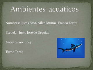 Este documento presenta información sobre diferentes ambientes acuáticos. Detalla ambientes dulceacuícolas, marinos y de transición, e incluye ejemplos de organismos que habitan cada ambiente. También explica la diferencia entre ambientes lóticos y lénticos.