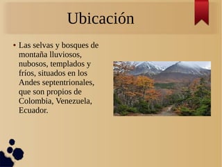 El documento describe el bosque andino patagónico. Se ubica en los Andes del norte de países como Colombia, Venezuela y Ecuador. Tiene un clima húmedo y frío causado por masas de aire húmedo del Océano Pacífico. Contiene flora como árboles y arbustos adaptados a las bajas temperaturas, y fauna como zorros grises, ciervos huemules y pequeños pudúes.