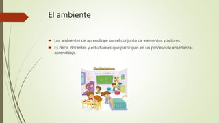 Los ambientes de aprendizaje son espacios donde estudiantes e instructores interactúan para fomentar experiencias educativas significativas y el desarrollo de competencias. Estos ambientes se clasifican en físicos, virtuales, formales e informales, y están compuestos por elementos como la organización del tiempo y los materiales que facilitan la enseñanza. Es fundamental que se establezcan condiciones propicias que estimulen la comunicación y el aprendizaje, considerando tanto la participación del docente como la autonomía del alumno.