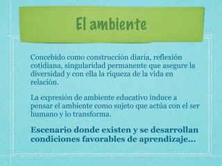 El documento describe los elementos clave de un ambiente de aprendizaje efectivo. Menciona que un ambiente de aprendizaje debe ser una construcción diaria que fomenta la reflexión, singularidad y diversidad. También debe considerar las interacciones entre estudiantes y el medio, así como los roles, criterios y actividades que se desarrollan. Además, un ambiente de aprendizaje exitoso proporciona espacios para la interacción, información, producción y exhibición.