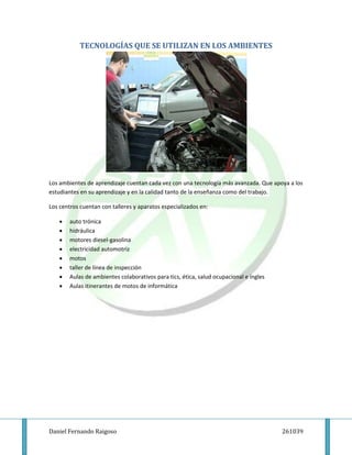 El documento describe los procesos de aprendizaje en un programa de mecánica diesel y automotriz del SENA, los cuales se enfocan en lo práctico, el mantenimiento de vehículos y su normatividad. Explica las tecnologías disponibles en los talleres como electrónica, hidráulica y motores, y las ocupaciones a las que pueden aspirar los estudiantes como técnicos en diferentes áreas automotrices. Finalmente, presenta ejemplos de proyectos en ejecución relacionados con el mantenimiento de vehículos y