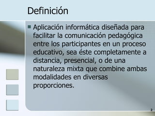 El documento describe los ambientes virtuales de aprendizaje, definidos como aplicaciones informáticas que facilitan la comunicación educativa entre participantes de forma presencial, a distancia o mixta. Explica que Moodle es un sistema de gestión de cursos flexible y fácil de usar seleccionado por la Universitat Jaume I debido a su combinación de flexibilidad didáctica, tecnológica y dinamismo de su comunidad de desarrollo.