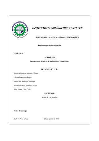Este documento presenta las características de un ingeniero en sistemas computacionales. Describe varias áreas en las que puede trabajar un ingeniero, incluyendo ingeniería de software, administración de TI, arquitectura de computadoras, software básico, telecomunicaciones, programación y tratamiento de información. El documento también explica algunas de las funciones clave de un ingeniero en estas áreas, como desarrollar software, administrar sistemas, diseñar hardware, administrar redes y representar información para resolver problemas.