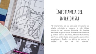 El documento describe diferentes especialidades dentro del diseño de interiores, incluyendo diseño residencial, comercial, hospitalario, de muebles y textiles. Explica que el diseñador debe actualizarse constantemente para responder a las necesidades cambiantes de la sociedad. También menciona que existen diferentes enfoques como diseño ecológico, feng shui, dirección artística y home staging. Finalmente, algunas estudiantes comparten su interés en especializarse en diseño residencial y de hoteles.
