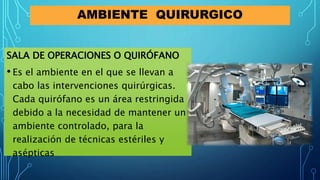 El documento describe las características del quirófano y las funciones del personal quirúrgico. El quirófano debe mantener un ambiente controlado y estéril para realizar cirugías. Se describen las áreas, diseño, ventilación, temperatura, iluminación y equipos necesarios. También se explican los niveles de desinfección y desinfectantes utilizados. Finalmente, se detallan las funciones de la enfermera instrumentista y la enfermera circulante durante una cirugía.