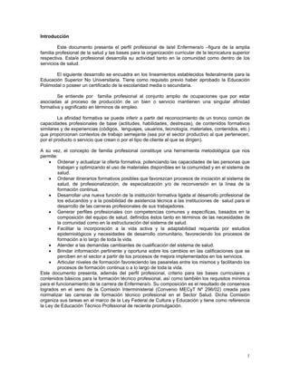 Este documento presenta el perfil profesional de la enfermera y las bases para la organización curricular de la carrera técnica de enfermería. Define la enfermería como una disciplina científica centrada en el cuidado y la promoción de la salud de las personas. Establece que la enfermera debe poseer conocimientos y habilidades para desarrollar acciones de salud tanto en el campo comunitario como clínico.