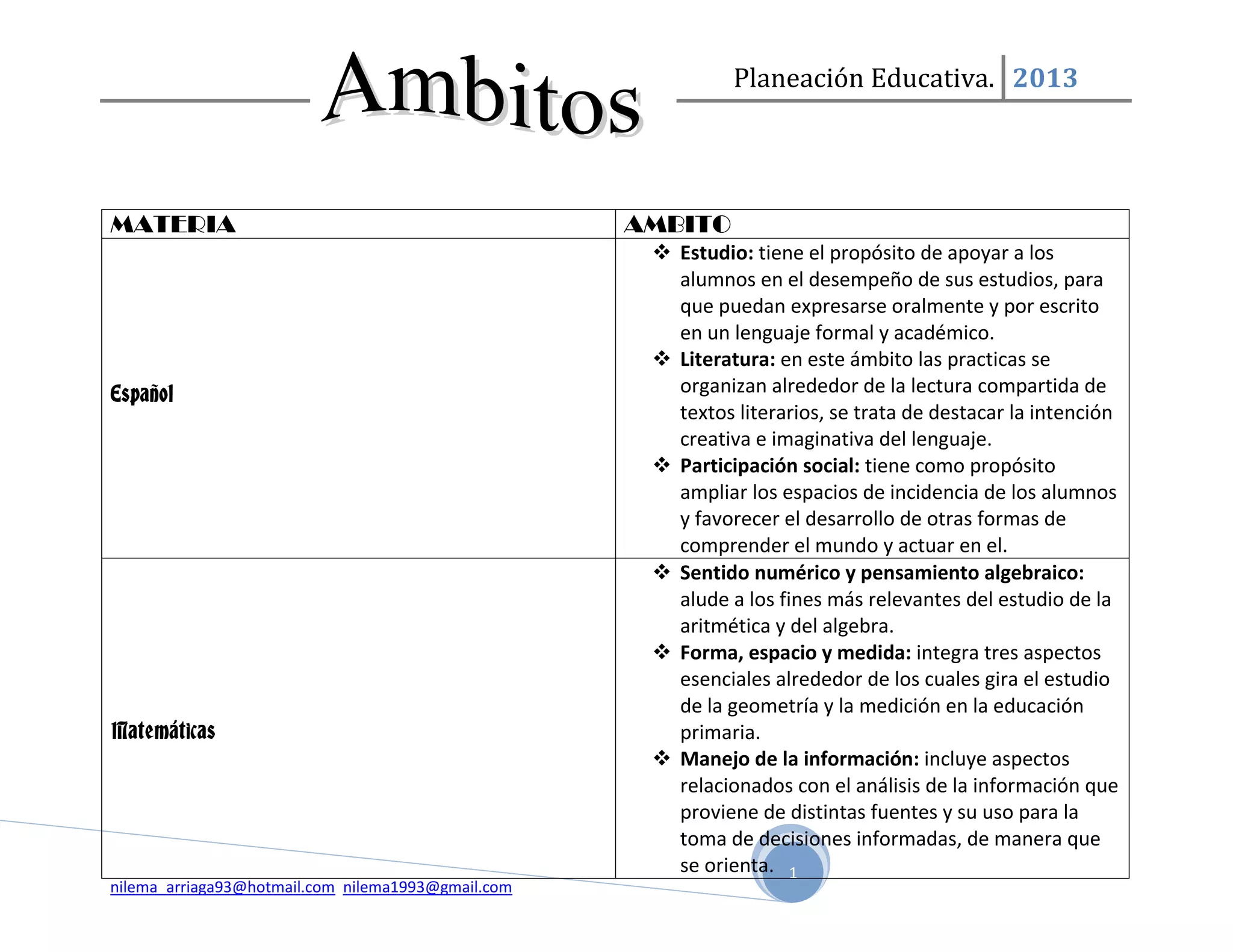 El documento describe los ámbitos de estudio de tres materias clave en la educación básica: Español (estudio, literatura y participación social), Matemáticas (sentido numérico, forma y espacio, y manejo de información), y Ciencias Naturales (desarrollo humano, biodiversidad, cambios físicos, propiedades de materiales, y tecnología). El objetivo es apoyar a los estudiantes en sus estudios y expresión, así como ampliar su comprensión del mundo a través de estas disciplinas fundamentales.