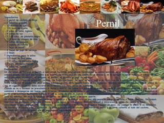 Pernil Ingredientes -1 pernil de cochino de 6Kgs - 2 cebollas grandes - 17 dientes de ajo - 1/2 taza de aceite - 2 cdas de salsa inglesa - 9 cdtas de sal - 1 1/2 cdts. de pimienta negra - 1/4 taza de vinagre de vino - 2 cdtas de oregano - 1 ramita de tomillo - 1 hoja de laurel - 2 tazas de jugo de naranja - 1 limón * Ingredientes para la salsa: - 1/2 taza de vino dulce - 1/2 cdta. de pimienta negra - 1 cdta. de salsa inglesa - 1 cdta. de harina Preparación Un día antes de hornear el pernil, o con varias horas de anticipación, se prepara un adobo poniendo en el vaso de una trituradora la cebolla picada, los ajos machacados y el aceite. Se trituran bien. Se vierte en un envase y se le agregan la salsa inglesa, 7 cdtas. de la sal la pimienta, el vinagre, el orégano, el tomillo, el laurel y el jugo de naranja. Se elimina el exceso de grasa del cochino. Se frota con limón. Se lava, se seca bien y se frota con las 2 cdtas de sal restantes. Se frota luego con el adobo. Se deja en una bandeja grande en la nevera hasta el día siguiente, dándole vueltas y bañandolo con el adobo de vez en cuando. El pernil debe sacarse de la nevera 1/2 hora antes de hornearlo. Cuando se va a hornear se precalienta el horno a 400*C. Se cubre con papel de aluminio, se mete al horno hasta ablandar y que la carne comience a despegarse del hueso, unas 4 horas, alrededor de 40 minutos por kilogramo. Se sube la temperatura a 450*C. Se descubre el pernil y se continua horneando bañándolo con su salsa de vez en cuando y dándole vuelta cuando sea necesario para dorarlo uniformemente unos 60 minutos. Se saca la bandeja del horno, se saca el pernil y se pone aparte. Se elimina el exceso de grasa que queda en la bandeja y se coloca esta en una olla pequeña sobre la hornilla a fuego mediano. Se raspan muy bien las partículas adheridas al fondo y a los lados de la bandeja, para enriquecer y oscurecer la salsa. Se cocina la salsa revolviendo y agregando el vino, la pimienta, la salsa inglesa y la harina si se quiere espesar un poco. Se corrige la sazón si es necesario. Se hierve y se cocina unos 10 minutos. Se pasa a través de un colador. Se hierve de nuevo y se sirve caliente al lado del cochino, cortando en tajadas delgadas que se espolvorean ligeramente con sal.