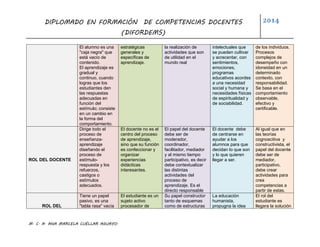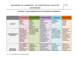 Este documento presenta una tabla comparativa de las principales teorías del aprendizaje: conductismo, cognitivismo, constructivismo, humanismo y por competencias. Describe las características, objetivos educativos, rol del docente y estudiante, interacción entre estudiantes, relación docente-alumno y evaluación para cada teoría. La autora concluye que cada teoría se desarrolló a partir de las anteriores y que el aprendizaje por competencias integra aspectos clave de todas las teorías.