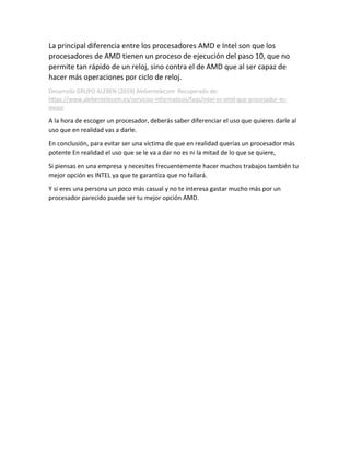 Este documento compara los procesadores Intel y AMD. Explica que aunque Intel es un 10% más rápido, cuesta un 300% más que AMD. AMD es un 10% más lento pero cuesta un 300% menos. El documento también indica que si el uso principal será para videojuegos, Intel sería la mejor opción, mientras que AMD puede ser mejor para usuarios casuales que no quieran gastar mucho. En resumen, depende del uso y el presupuesto, Intel ofrece más potencia mientras que AMD puede ser una mejor inversión.