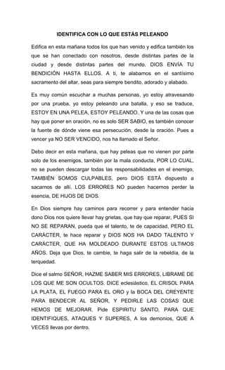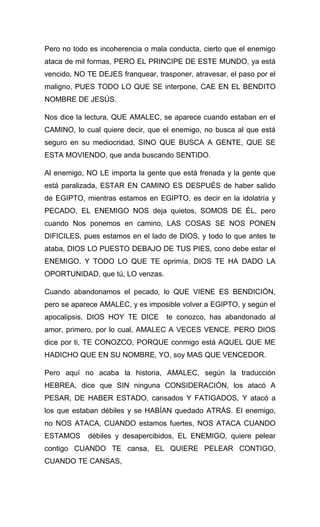 Este documento habla sobre las batallas espirituales que enfrentan los creyentes y cómo vencer al enemigo. Explica que a veces las dificultades vienen por nuestros propios errores, pero que Dios siempre nos da la fuerza para superarlos. También advierte que el enemigo ataca cuando estamos débiles, por lo que debemos orar y delegar responsabilidades para no cansarnos. Finalmente, anima a entregarse completamente a Dios para que rompa todo lo que nos ata y nos llene de su poder.