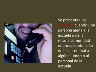 Este documento ofrece información sobre amenazas y extorsiones en escuelas, incluyendo cómo reconocerlas, reportarlas a las autoridades correspondientes y mantener la seguridad. Se describen diferentes tipos de amenazas como telefónicas, anónimas, digitales o en persona, y se recomienda siempre reportarlas sin intentar negociar. También incluye consejos de seguridad como observar el entorno, trabajar en equipo con las autoridades y no generar pánico.