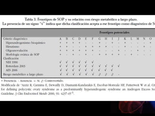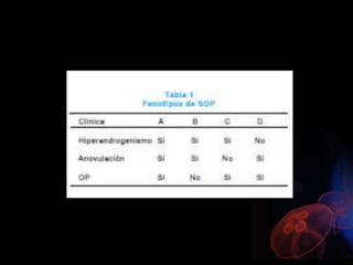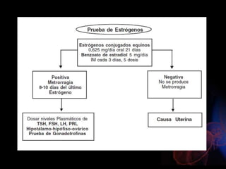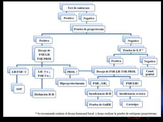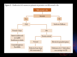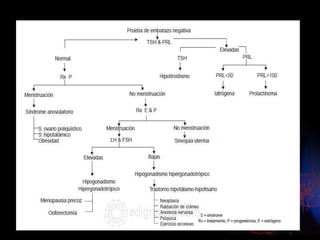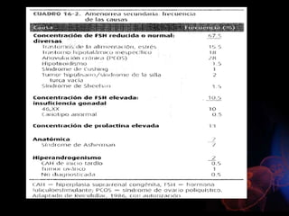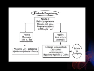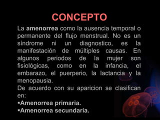 Este documento describe la amenorrea, definida como la ausencia de la menstruación. Explica que puede ser primaria o secundaria y que puede deberse a causas fisiológicas o patológicas. Resume las cuatro categorías principales de clasificación de la amenorrea primaria según la presencia o ausencia de mamas y útero, y describe algunas de las causas más comunes dentro de cada categoría. También resume brevemente algunas causas frecuentes de amenorrea secundaria como el síndrome de ovario poliqu
