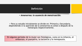 1. La amenorrea se define como la ausencia de menstruación y se divide en primaria y secundaria dependiendo de si ocurre antes o después de la menarquía.