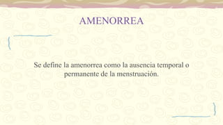 Este documento describe diferentes tipos de amenorrea, incluyendo amenorrea primaria y secundaria. La amenorrea primaria se define como la ausencia de la primera menstruación y puede deberse a causas centrales, hipofisarias o periféricas. La amenorrea secundaria ocurre en mujeres que previamente tuvieron reglas y se debe a causas uterinas, ováricas, hipofisarias o hipotalámicas. El documento también clasifica y explica las posibles causas de cada tipo de amenorrea.