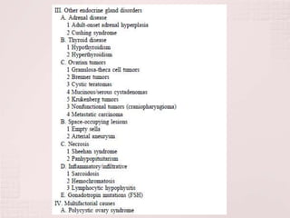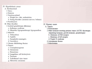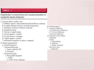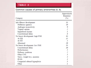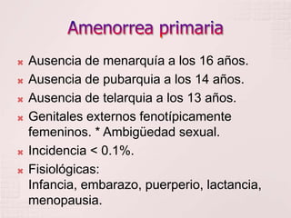 1) La amenorrea primaria se refiere a la ausencia de menstruación a ciertas edades y puede deberse a causas congénitas, endocrinas, anatómicas o genéticas.