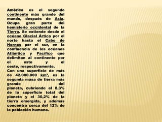 1) América es el segundo continente más grande del mundo y se extiende desde el océano Ártico hasta el cabo de Hornos.