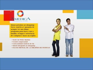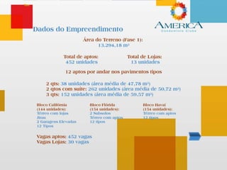 El documento describe un desarrollo en la ubicación de la Estrada Adhemar Bebiano, con 13 tiendas de diferentes tamaños. Incluye diversas áreas recreativas, como piscinas, cancha de fútbol, gimnasio y salones de fiestas. Se menciona la presencia de una guarita y un plan maestro para el espacio.