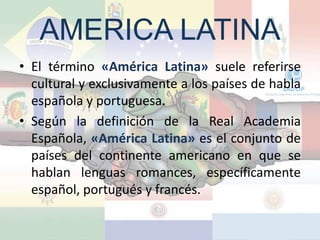 Este documento proporciona información sobre América Latina. Resume que América Latina incluye países de habla hispana y portuguesa en las Américas, y destaca las similitudes y variaciones culturales, económicas, demográficas y otros aspectos entre los países de la región. También enumera los países que conforman América Latina.