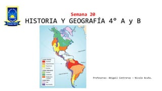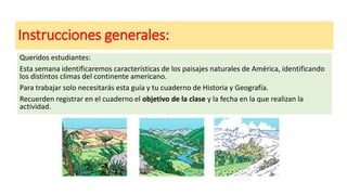 El documento presenta información sobre las características naturales de América, dividiendo el continente en tres grandes regiones - América del Norte, América Central y el Caribe, y América del Sur. Explica que en América se pueden encontrar paisajes asociados a las distintas zonas climáticas de la Tierra, incluyendo la zona cálida, las zonas templadas y las zonas frías. Los estudiantes deben identificar y nombrar estas zonas climáticas en América en su cuaderno.