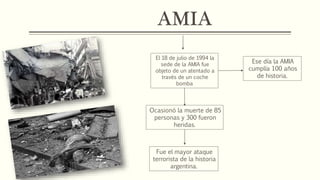 El documento resume la historia del atentado terrorista a la sede de la AMIA en Buenos Aires en 1994 que causó 85 muertes. Incluye una línea de tiempo con los eventos clave en la investigación a través de los años, que apuntó a Irán como responsable pero no logró condenas. También describe la controversia sobre el Memorándum de Entendimiento firmado entre Argentina e Irán en 2013 y la denuncia y muerte del fiscal Alberto Nisman en 2015.
