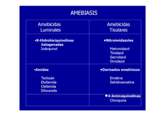 El documento describe la amibiasis, una infección causada por el parásito Entamoeba histolytica. Se presenta la estructura y ciclo vital del parásito, así como sus manifestaciones clínicas como colitis aguda, colitis fulminante, apendicitis amibiana y ameboma. Explica que la infección puede ser asintomática o sintomática con daño tisular, y que el diagnóstico se realiza principalmente a través de exámenes coproparasitoscópicos.