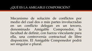 Este documento describe la amigable composición, un mecanismo de resolución de conflictos en el que dos o más partes involucradas en una disputa contractual le delega a un tercero llamado amigable componedor la facultad de definir una solución vinculante. El procedimiento comienza con una solicitud presentada a un centro que describe los hechos y lo solicitado, adjuntando pruebas. La decisión del amigable componedor es obligatoria y tiene el efecto de una transacción. La amigable composición ofrece ventajas como simplicidad