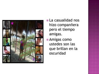 La amistad es lo más importante en la vida, ya que aunque todo cambia, los amigos verdaderos permanecen. La autora expresa su aprecio y gratitud por sus amigas, a quienes considera brillantes y en quienes puede confiar en todo momento. Les asegura su apoyo incondicional.