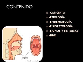 La amigdalitis consiste en la inflamación de las amígdalas, generalmente causada por infecciones virales o bacterianas. Los síntomas incluyen dolor de garganta, fiebre y ganglios linfáticos inflamados. La amigdalitis aguda suele ser autolimitada, pero la crónica puede causar hipertrofia amigdalar. La prevención incluye buena higiene, evitar contacto con enfermos y tratamiento oportuno de infecciones.