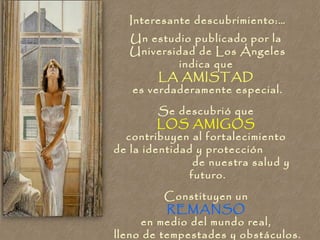 Un estudio de la Universidad de Los Ángeles descubrió que la amistad fortalece la identidad, protege la salud y el futuro. Los amigos nos ayudan a llenar vacíos emocionales y recordar quiénes somos. Investigaciones muestran que las hormonas oxitocina y dopamina, liberadas cuando estamos con amigos, reducen el estrés y generan sensaciones positivas. La amistad auténtica también reduce riesgos de salud y se cree que prolonga la vida.