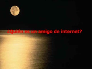 Este documento describe al amigo de Internet como alguien que se comunica a través del monitor, envía mensajes de humor y cariño aunque no reciba respuesta, y está presente para alegrar a la distancia en momentos de soledad o desamor. El amigo de Internet descubre la desnudez del alma sin necesidad de verse en persona y aunque envíe muchos archivos, lo hace con cariño. Es un amigo leal que sabe valorar a la persona.