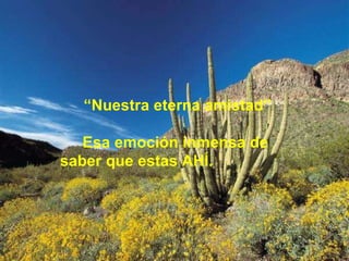 El documento habla sobre la eterna amistad entre personas que se conocen desde hace mucho tiempo. Aunque a veces los amigos no se ven con frecuencia debido a que sus vidas los llevan por caminos diferentes, cuando se reencuentran celebran su amistad. La vida de los amigos es viajar, cantar, reír y llorar juntos, ganar y perder pero al final la amistad prevalece y los amigos nunca se olvidan el uno del otro.