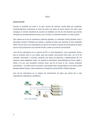 Una red de ordenadores es un conjunto de dispositivos como PCs y periféricos que se conectan entre sí con cables para compartir información y recursos. Las redes varían en tamaño desde redes locales (LAN) en una oficina hasta redes extensas (WAN) a nivel mundial. Una topología común es la red en estrella donde los dispositivos se conectan a un punto central que controla el flujo de datos y permite la comunicación entre todos los nodos.