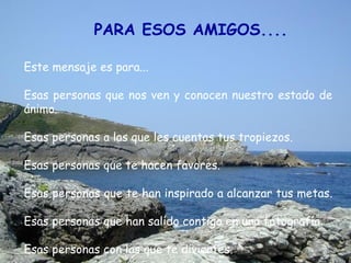 Este mensaje expresa gratitud hacia amigos cercanos que han brindado su apoyo y compañía a través de los años, a pesar de los cambios que ocurren en la vida. Aunque a veces las personas se alejan debido a ocupaciones, la amistad debería perdurar más allá del tiempo y las circunstancias. El autor anima al receptor a valorar la suerte de contar con amigos especiales y a compartir este mensaje con ellos.