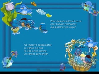 El documento es una canción que habla sobre la importancia de la amistad y cómo los amigos siempre estarán presentes en los buenos y malos momentos sin importar el tiempo o la distancia. Resalta que un amigo es como una luz que brilla en la oscuridad y que la amistad es más importante que cualquier otra cosa.