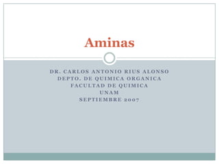 1) El documento describe diferentes tipos de aminas como alcaloides y aminas biológicamente activas. 2) Explica la estructura del amoniaco y las aminas y cómo la inversión del nitrógeno puede interconvertir enantiómeros. 3) Detalla propiedades, reactividad y ejemplos de reacciones de oxidación, acilación y eliminación de aminas.